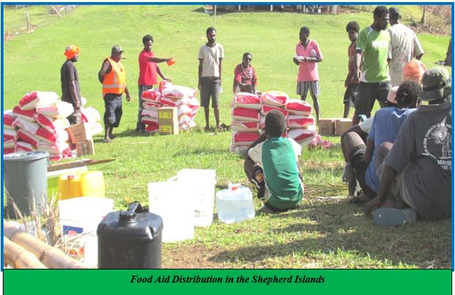 Food aid in the form of Rice, Canned Meat and noodles was sourced by FSAC through the NDMO Emergency Operations Centre and distributed to affected islands of Mere Lava, Maewo, Pentecost, South Malekula Ambrym, and all of Shefa and Tafea. Over 300 tonnes of rice and other food supply was distributed to the above communities.
